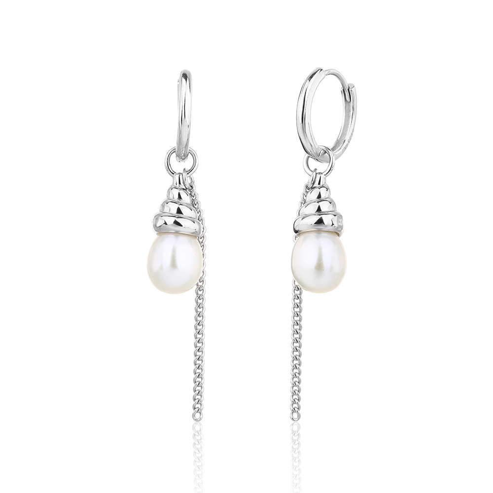 עגילי חישוק כסף בעיצוב קלאסי, עם תליון פנינה אלגנטי ושרשרת דקה שנופלת מטה ליצירת תנועה רכה ונשית. שילוב מושלם של עדינות יוקרתית עם מראה מודרני.
