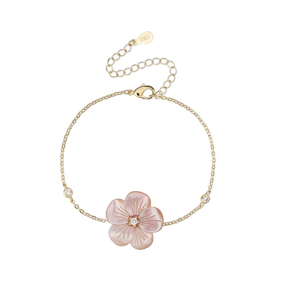 צמיד זהב אלגנטי בעיצוב עדין, משולב עם תליון פרח לבן מרהיב במרכזו. הפרח מעוטר באבן נוצצת שמוסיפה נגיעה של ברק עדין, בשילוב שלושה זרקונים קטנים המשובצים לאורך השרשרת. תכשיט מושלם למראה נשי, רך ואלגנטי שמתאים לכל שעה ביום.
